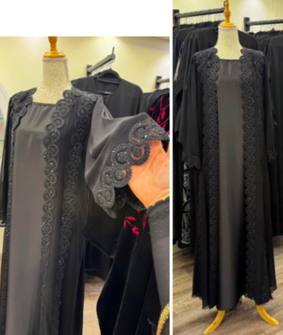 Ce modèle se distingue par ses finitions couture : une dentelle luxueuse, travaillée en bordures raffinées, sublimée par de délicats strass qui captent la lumière avec subtilité. Un détail précieux, parfaitement dosé, qui apporte à l'abaya un éclat élégant, sans jamais tomber dans l'excès.